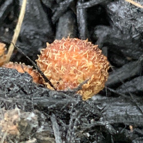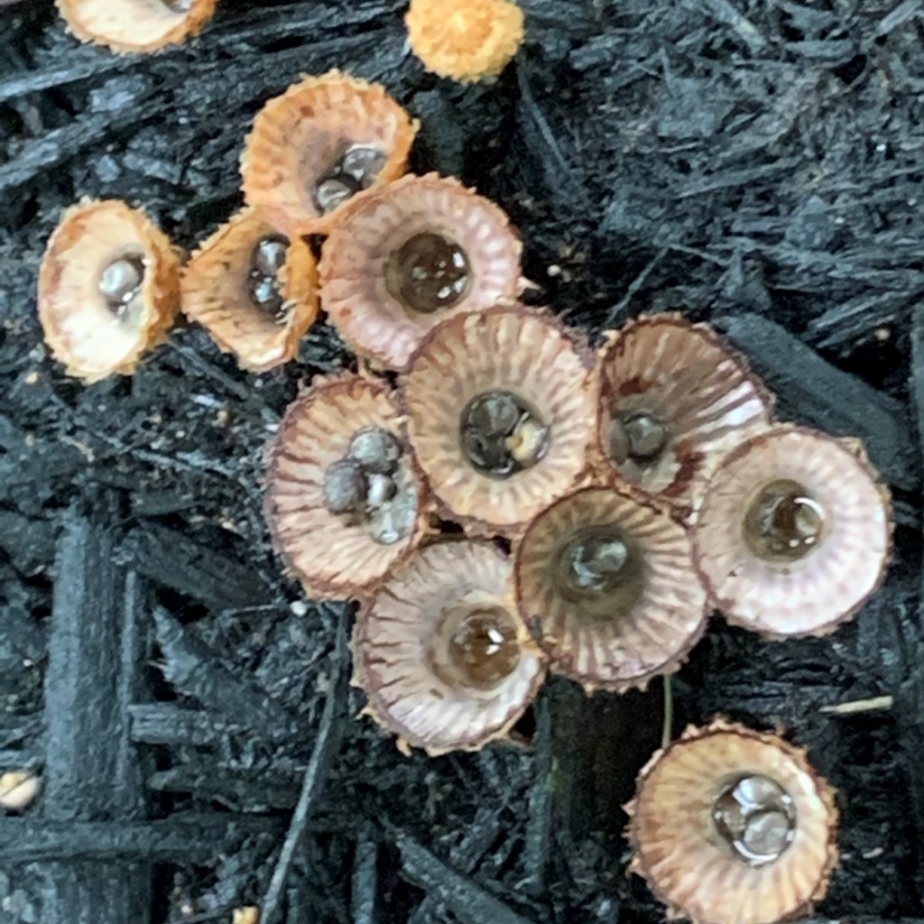 Common Name: Bird’s Nest Fungus, Splash Cups, Fluted Bird’s Nest – Each of the individual fruiting bodies of the fungus looks like a miniature bird’s nest, complete with what appear to be eggs. Splash cups is a minimalist description of the method of spore dispersal.