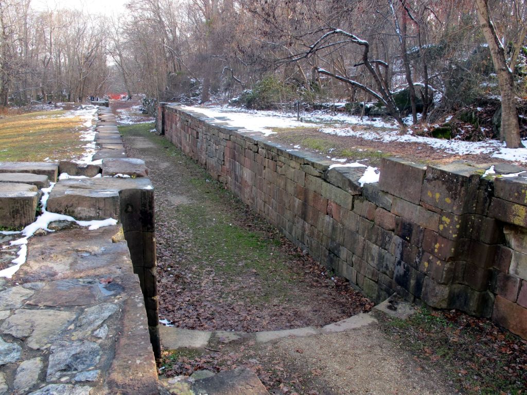 There were five sections of the Potomac River that were impassable to watercraft due to rapid currents, shallow depths, and waterfalls. Great Falls, the only true waterfall and Little Falls, an area of rapids just upstream of Georgetown, were the only two that would require a series of locks and canal segments to bypass the river altogether. The other three, Seneca Falls on the Virginia side of the Maryland creek of the same name and House and Shenandoah Falls near Harper’s Ferry would require only dredging of canal passages for deep draft boat access. Even though the Patowmack charter provided “liberal wages” for “any number not exceeding one hundred good hands” each provided with one pound of salt pork and three jills of rum daily, laborers were hard to find. The task of building multiple canals in five different locations proved to be daunting, with progress plagued by periodic flooding, delays in construction material supplies, and poor management. The five locks for the 80 feet of vertical elevation change for the canal passage around Great Falls were not completed until 1802, seventeen years after the first work started and fourteen years later than predicted at the outset. The Patowmack canal system boats and barges carried thousands of barrels of flour and whiskey and bushels of corn and wheat between Georgetown and Cumberland until 1828, when bankruptcy forced divestiture.[6] Its successor as fall line bypass was the Chesapeake and Ohio Canal, initiated on the 4th of July 1828 with President John Quincy Adams presiding at the ground-breaking ceremonies. On that same day in the Patapsco basin near Baltimore, the first rails of the Baltimore and Ohio Railroad were laid with Charles Carroll presiding as the only surviving signer of the Declaration of Independence. The C&O Canal would eventually meet the same fate as the Patowmack, becoming obsolescent and financially unsound as the railroads that could move heavy loads across the fall line without the need for waterborne carriage offered a cheaper alternative.
