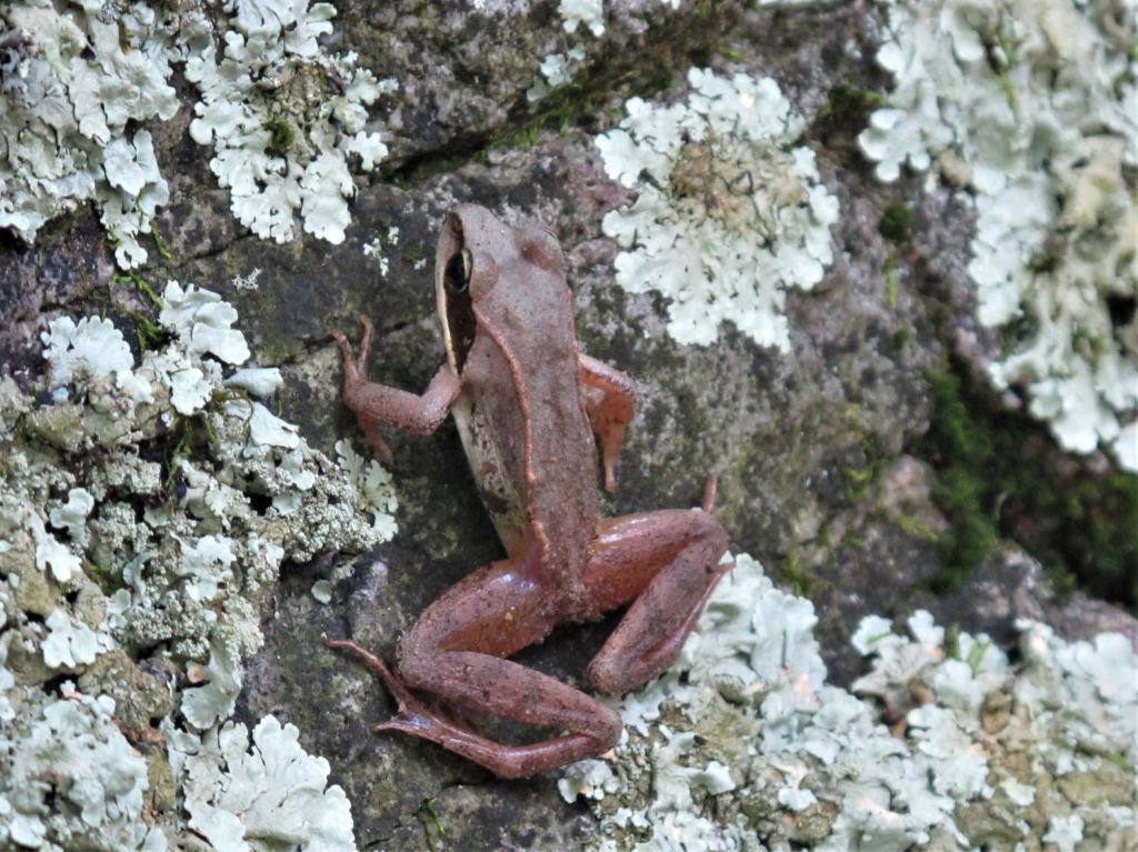 Scientific Name: Rana sylvatica – Rana is the Latin word for frog which differs from the Sanskrit origin as an onomatopoeia of their call … like croak or ribbit in English. The Latin word for woodland is silvae. The scientific name is literally “frog wood,” the opposite of the common wood frog name. Wood frog have been reclassified by modern DNA taxonomy to Lithobates sylvaticus from the Greek lith meaning “stone” and bates meaning “one who treads,” which would connote “stone walker.” This could be literal, as is the case for the wood frog depicted above climbing on a lichen-covered rock.