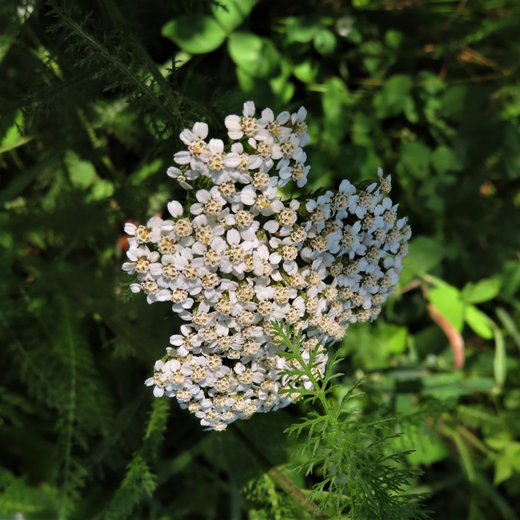 Scientific Name: Achillea millefolium – The name of Achilles, the Greek hero of Homer’s Iliad, is recognizable as the genus. The species name means “thousand-leaf” in Latin ― one of the common names. The distinctive appearance is characterized by small fern-like leaves extending outward from the upright stem holding up a white bouquet.
