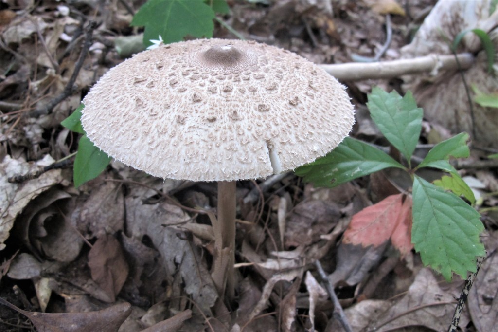 Common Name: Parasol Mushroom – The umbrella analogy is applicable to all mushrooms that have a stem or stipe holding up a cap or pileus. Since the umbrella (from the Latin umbra meaning shade) is equally a protection against rain or sun, parasol (Latin parare to shield and sol, the sun) is equally apt. Parasol is applied only to this mushroom out of the thousands of possible candidates due to its exceptionally broad cap held aloft by a relatively narrow handle-like stem.