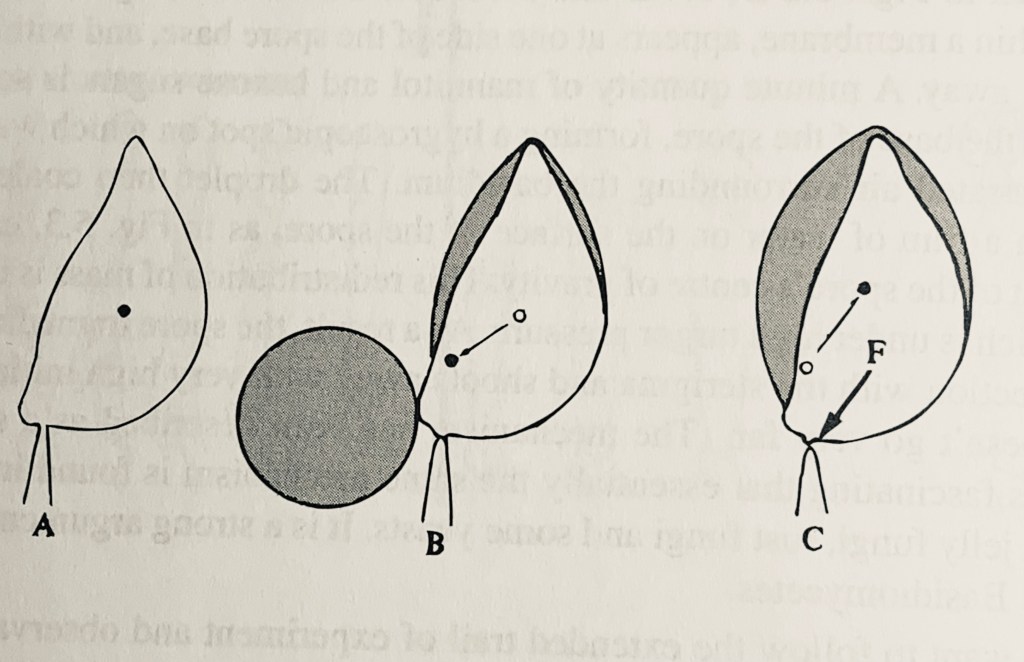 So why does the air under the mushroom cap need to have plenty of water vapor? Because the spores need to be literally shot away from the gills so that they can freefall into the wind for dispersal. The motive force that ejects each spore outward is the result of the condensation of water vapor into a tiny droplet. Gills are like vertical, side-by-side slats suspended from the underside of the cap. The reason for this arrangement is to maximize the surface area available to be able to produce as many spores as possible; a flat surface would provide only a small fraction of the area with gills. Because the probability of any one spore successfully germinating to produce a new fungus is vanishingly small, mushrooms need to produce millions of spores to succeed. Since the gills are mounted vertically on the gills rather than horizontally, a spore, if simply released, would remain stuck to the surface. Nature’s evolutionary solution is to literally shoot the spore horizontally, away from the side of the gill into the air gap between gills so that it can then fall due to gravity. Each spore is held at the tip of a stalk called a sterigma at a point called the punctum lacryman (Latin for the “point that cries”) depicted in the figure at A. It is here that the water vapor condenses, shown in B. The water droplet extends onto the spore surface in C due to surface tension, causing the center of gravity of the spore/water mass to shift rapidly to create what is called a surface tension catapult force (marked with an F in the figure). The miniscule (about 10 microns in diameter) spore is ejected outward at a speed of about 10 miles per hour with an acceleration of 25,000 times the force of gravity (called G-force). First hypothesized at the beginning of the 20th century, the catapult force was captured by high-speed camera about twenty years ago. The mechanics was demonstrated conclusively by modelling the spore/sterigma interface using polystyrene hemispheres just five years ago. [6] Fungi have been described as fantastic with good reason.