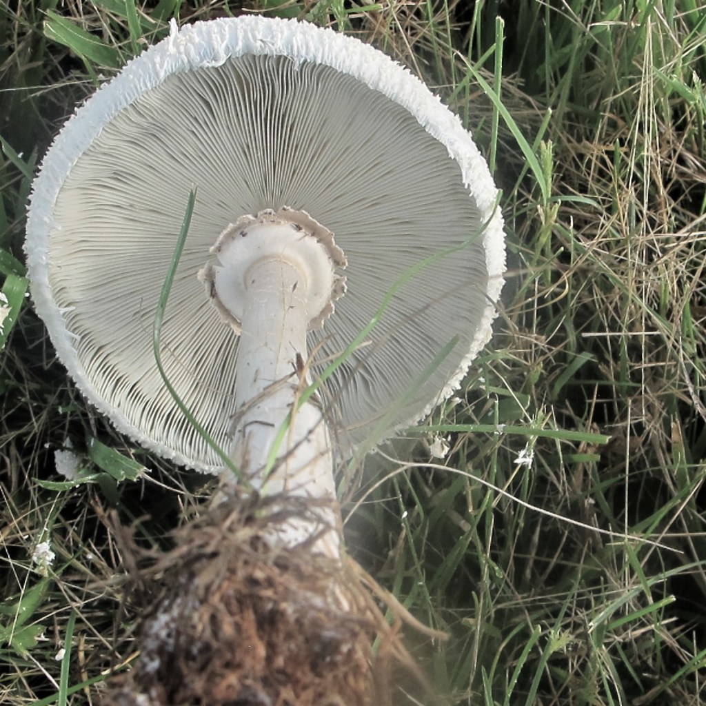 Since this article is about Parasol Mushrooms, it is apropos to address the mushroom umbella analogy. The logic of syllogism would suggest that if it looks like an umbella, then it must be a rain shield. In reality, the cap has the opposite function – to retain water. The umbrella shape is to ensure that there is enough humidity as water vapor on the underside of the cap for water droplets to condense in the vicinity of the spore-bearing gills. To explain why this is so, a few points about mushroom physiology must be noted. A mushroom is a fruiting body that is produced by a fungus, the tangled mass of thread-like strands called a mycelium that is wholly underground or inside dead wood. The only function of the fruiting body mushroom is to spread the reproductive spores into the environment to propagate the species (like apples on an apple tree). When a fungal mycelium is ready to reproduce, it forms a self-contained and out of sight proto mushroom called a primordium. Once fully formed, the fungus waits for promising weather, which is quite frequently after substantial rain has fallen. This is why mushrooms mysteriously appear overnight after rain; they are already there, ready, and waiting. Once the mushroom erupts from its hypogeal lair, the cap opens, separating the partial and/or universal veil if it has one, exposing the gills to the surrounding air for the first time. [5]