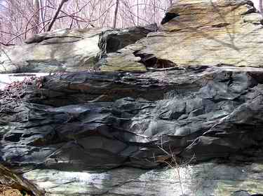 The Catoctin Formation has the colloquial name greenstone due to the gray-green coloration of many outcroppings, a result of its metamorphic journey. The Catoctin basalt is comprised of phenocrysts (large crystals) of plagioclase feldspar named albite in a fine-grained matrix of the minerals chlorite, magnetite, actinolite, pyroxene and epidote. Epidote is a structurally complex mineral of calcium, aluminum, iron and silicon [Ca2 (Al, Fe) 3(SiO4)3(OH)] that has a green color described as pistachio. It is this mineral that, when present, gives the Catoctin Formation a distinctive greenish hue. The sequential lava flows over an extended period are reflected in the diversity of the Catoctin Formation. The boundaries between the lava flows are marked by breccias, metatuffs, and metasandstone. Breccia is a rock comprised of smaller rock fragments cemented together by sand, clay and/or lime. These rocks identify areas where a crust formed on a lava flow that was disrupted by subsequent flows. A tuff is a porous rock created by a consolidation of volcanic ash. The metabolized tuffs, or metatuffs, are attributed to a rapidly moving cloud of molten ash. The metabolized sandstones, or metasandstones, mark the boundary between one lava flow, a period of erosion and sedimentation, and a second lava flow. [11]