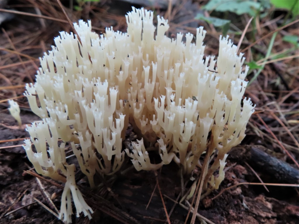 Common Name: Coral Fungus – The branching of the fungal thallus resembles the calcium carbonate structure of ocean corals. Other common names are applied to differentiated shapes, such as worm, club, or tube fungi for those lacking side branches and antler fungi for those with wider, flange-like appendages. An extreme is cauliflower fungus which looks nothing like coral but is usually included in the coral-like category in field guides. The common Crown-tipped coral is depicted; the ends of the coral segments have tines like miniature crowns.