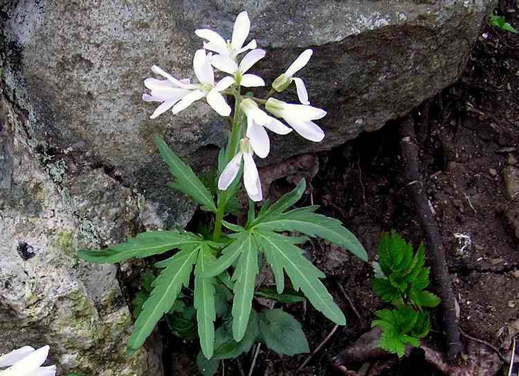Cut-leaved toothworts employ a supplemental growth feature in the form of a root structure called a rhizome that extends horizontally from each plant to enable vegetative growth. The name toothwort is due to the resemblance of the rhizome to a jawbone with bumps that suggest teeth along its length. The bumps-cum-teeth are the origination points for individual flower stems that grew upward over the course of previous spring emergence. [5] This is a feature of a perennial plant, taking advantage of a well established root structure from which to grow and spread. While the four-petaled white to pink flower is what attracts ambling hikers for its beauty and itinerant insects for its pollen and nectar, it is the root for which it is named that establishes a niche in the ethnobotanical catalogues as both a food and as a medicinal. While cut-leaved toothwort flowers each produce about ten seeds, amounting to as many as 100 seeds per plant, their fertilization and growth is infrequent, relying mostly on the anastomosis of spreading rhizomes for extension into new frontiers. [6]