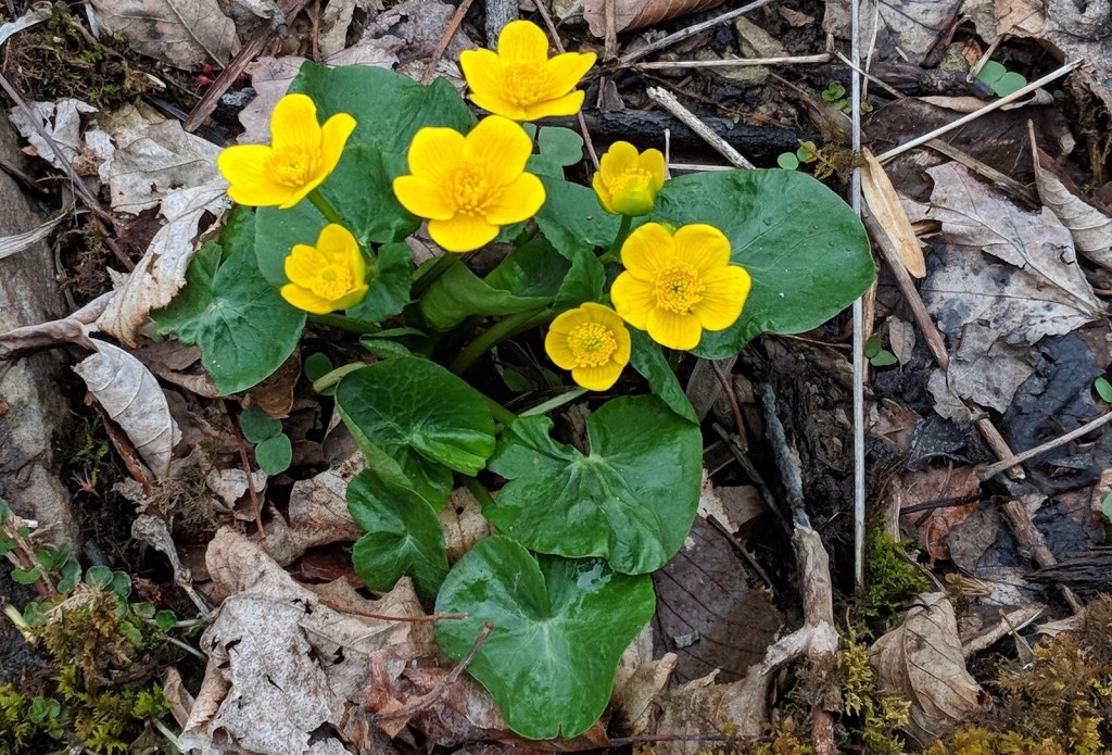 Common Name: Marsh Marigold, Cowslip, Mayflower, May blobs, Marybuds, Water blobs, Horse blobs, Bull’s eyes, Meadow routs, Verrucaria, Solsequia, Sponsa solis, Kingcups – The primary common name is from the Middle English marigolde, a combination of Marie, thought to refer to the Virgin Mary, and gold for the color; Marsh is in reference to its preferred habitat.
