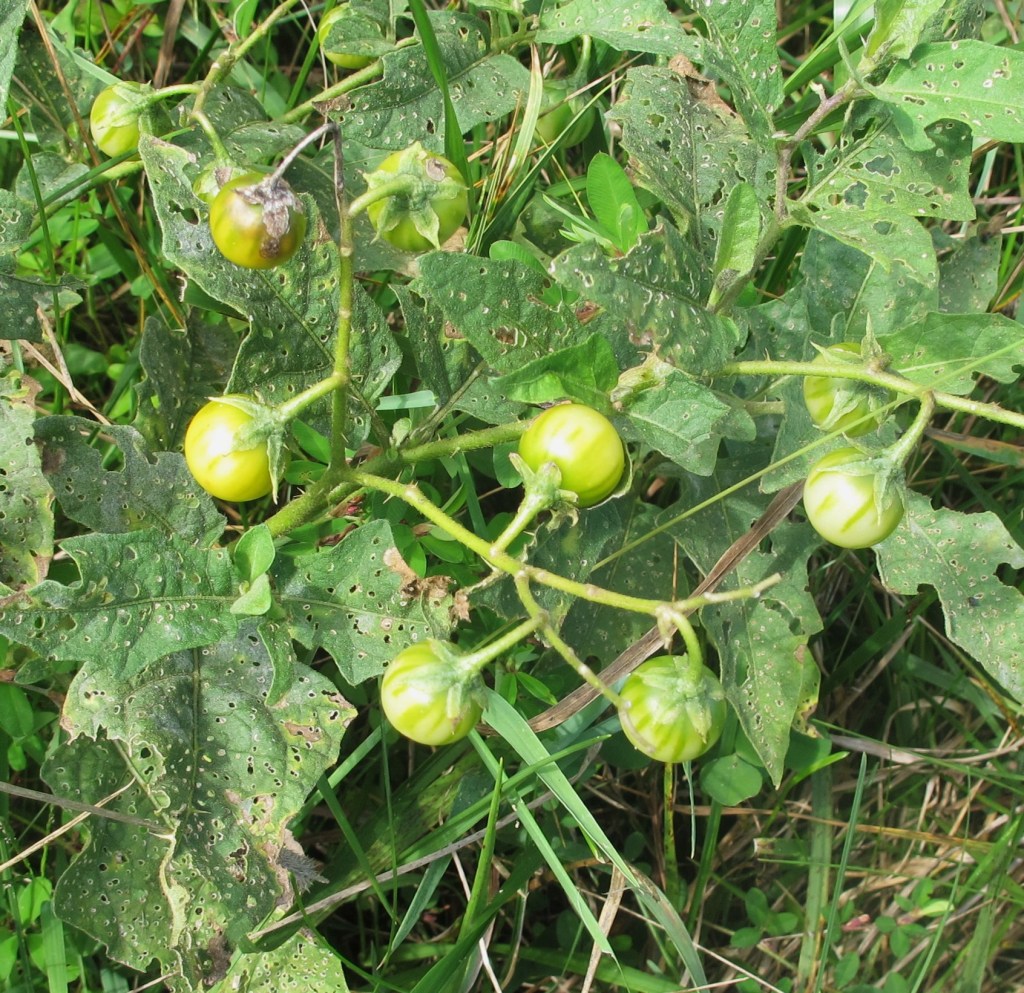 The vast majority of twenty first century humans have plenty to eat―in many cases too much. There is no cornucopia in the wild where life is “nasty, brutish, and short” according to Thomas Hobbes. Many insects and a few animals consume not only the horsenettle fruit, but also the bitter, normally poisonous leaves and stems as well. A study conducted in Virginia over a period of six years (1996-2002) revealed that 31 insects from six different orders ate horsenettle voraciously. In fact, a detailed survey of 960 horsenettle plants found that the plants were severely damaged. And it wasn’t just bugs, as meadow voles also consumed horsenettle with no apparent ill effects. The most damaging insect species were those that also fed on other Nightshade family plants including the eggplant flea beetle and the false potato beetle in keeping with the evolutionary pathway of alkaloid tolerance. Fruits were assessed separately due to their importance in propagation as the seed bearing component of the plant. The three species accounted for 75 percent of fruit damage were false potato beetles, pepper maggots, and meadow voles. [9] This also provides some validity to the overall scheme of life with plants producing sweet, tasty fruit to attract animals for seed dissemination.