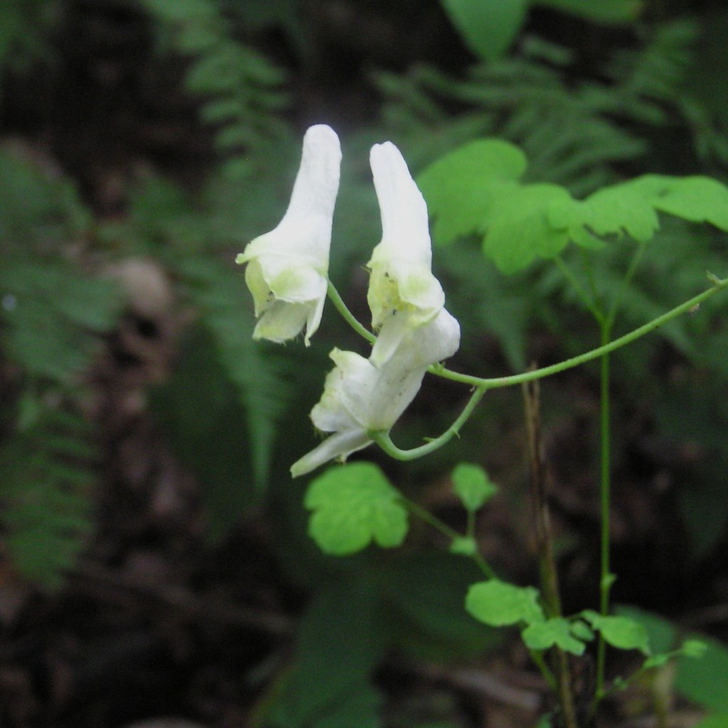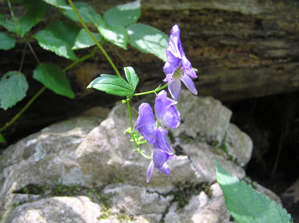Potpourri: Monkshood has one of the best descriptive names among flowers. The arched petals that extend over the stamen and stigma complex of the flower’s reproductive organs is similar in form, if not function, to the cowl of the cassock worn by monks to emphasize religious piety and plainness; there is no need for a mnemonic. While the flower is not all that common in North America (except as a garden varietal), it is much more so in the Mediterranean basin, where it rose to prominence in prehistorical accounts due to its use as both a medicinal in small doses and as a deadly poison above a low lethal threshold. Its unusual shape can only have evolved to attract a particular pollinator, as flowers can have no other function that to employ the mobility of animals to transfer the male pollen to the female ovary. The plant itself is spindly, depending on the support of other adjacent plants [2]. This too is a matter of successful evolution, midway between a free-standing shrub and a draped, climbing vine. A smaller, white variant called Trailing Wolfsbane (A. reclinatum) is also found in the southern Appalachians.