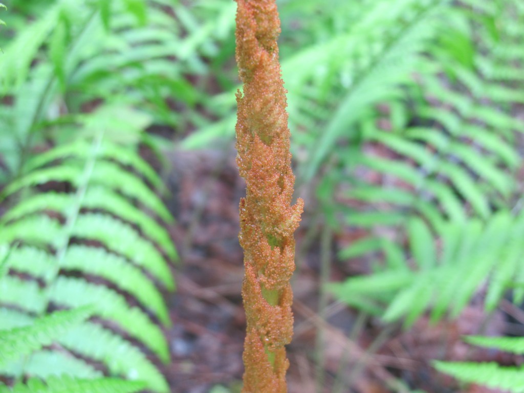 Potpourri: Fern-like plants were among the original land biota, appearing with liverworts and mosses in the Devonian Period some 390 million years ago. They were the first vascular plants in having vessels or ducts to carry water and minerals upward and sustaining sugars downward to extend and expand photosynthetic tissues toward solar energy, unlike their ground hugging cohorts. They reached prominence in number and size during the succeeding Carboniferous Period, sometimes called the “Age of Ferns,” forming the coal beds that powered the Industrial Revolution of the 19th Century that created the carbon dioxide problems of the present (ferns are not at fault). While the primeval ferns appear only in the fossil record, their ancestors are evident to this day wherever the combination of wetness and sunlight meet the necessary and sufficient ecological requirements for their growth. [2] The osmundaceous ferns are among the oldest of those that still prevail, their longevity a result of robust physiology and adaptability, even to meteoric cataclysms like the Cretaceous – Paleogene extinction that extirpated all dinosaurs except birds. The species named royal fern, Osmunda regalis, is the only vascular plant to have been found on all seven continents.