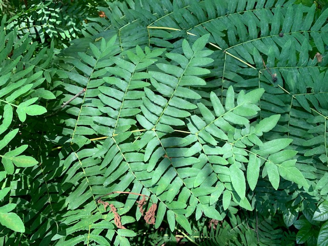 The Pteridophyte Phylogeny Group (PPG) was established to bring DNA order out of the Linnaean farrago. Even though this seminal 2016 classification lists 11,916 species, 337 genera, 51 families, 14 orders, and 2 classes of ferns and fern allies (the lycophytes, mostly club mosses), it carries the caveat of “not intended as the final word … but rather a summary statement of current hypotheses.” This caution relates to complexity in evolutionary change in general and to the peculiarities of ferns in particular. The PPG restricted monophyletic lineage (single ancestor) only at the genus level and above because of fern polyploid speciation, which is a mutation where the number of chromosomes is increased. Humans have two sets of 23 chromosomes (46 total) which is referred to as 2n; polyploidy would make this 3n or more. It is estimated that more than a third of all fern species are correlated to a change in ploidy. Even within the strictures of DNA analysis, the royal fern family Osmundaceae retained its coherence and relevance as the most ancient of the extant ferns. However, the royal, cinnamon and interrupted ferns, which used to all be in the genus Osmunda (and are still listed there in most field guides and in Encyclopedia Britannica) are now, tentatively in three separate genera. [12]
