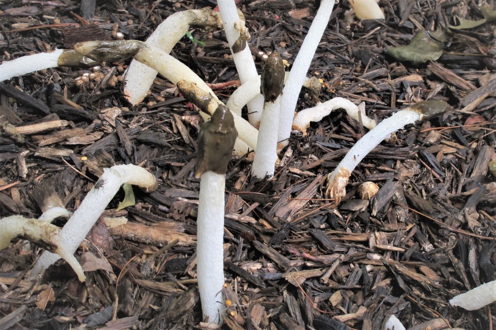 The phallic appearance of some stinkhorns is not as outré as it seems at first blush. The priapic shaft elevates spores to promote dissemination. Like a fungal Occam’s razor, stinkhorns evolved the simplest solution―growth straight upward with no side branches, placing the spore gleba at the bulbous apex. The fungus accomplishes this in a manner similar to humans, using water pressure to hold the shaft erect in lieu of blood pressure; hydrostatic versus hemostatic. The phenomenon is part of the fungal life cycle that starts in the mycelium, the underground tangled mass of threadlike hyphae that is the “real fungus.” The stinkhorn starts in the mycelium as an egg-shaped structure called a primordium containing the erectable shaft surrounded by spore laden gleba held firmly in place with jellied filler cloaked with a cuticle. It is the fruiting body of the fungus. When environmental conditions dictate, the “egg hatches,” and the water pressurized shaft grows outward and upward lubricated by the jelly at a rate of about five inches an hour until it reaches fly over country. Here the biochemistry of smells including hydrogen sulfide (rotten eggs), mercaptan (rotting cabbage), and some unique compounds aptly named phallic acids draws flies from near and far. In ideal conditions, the slime and spores will all be gone in a few hours, and the bare-headed implement of reproduction will soon become flaccid.
