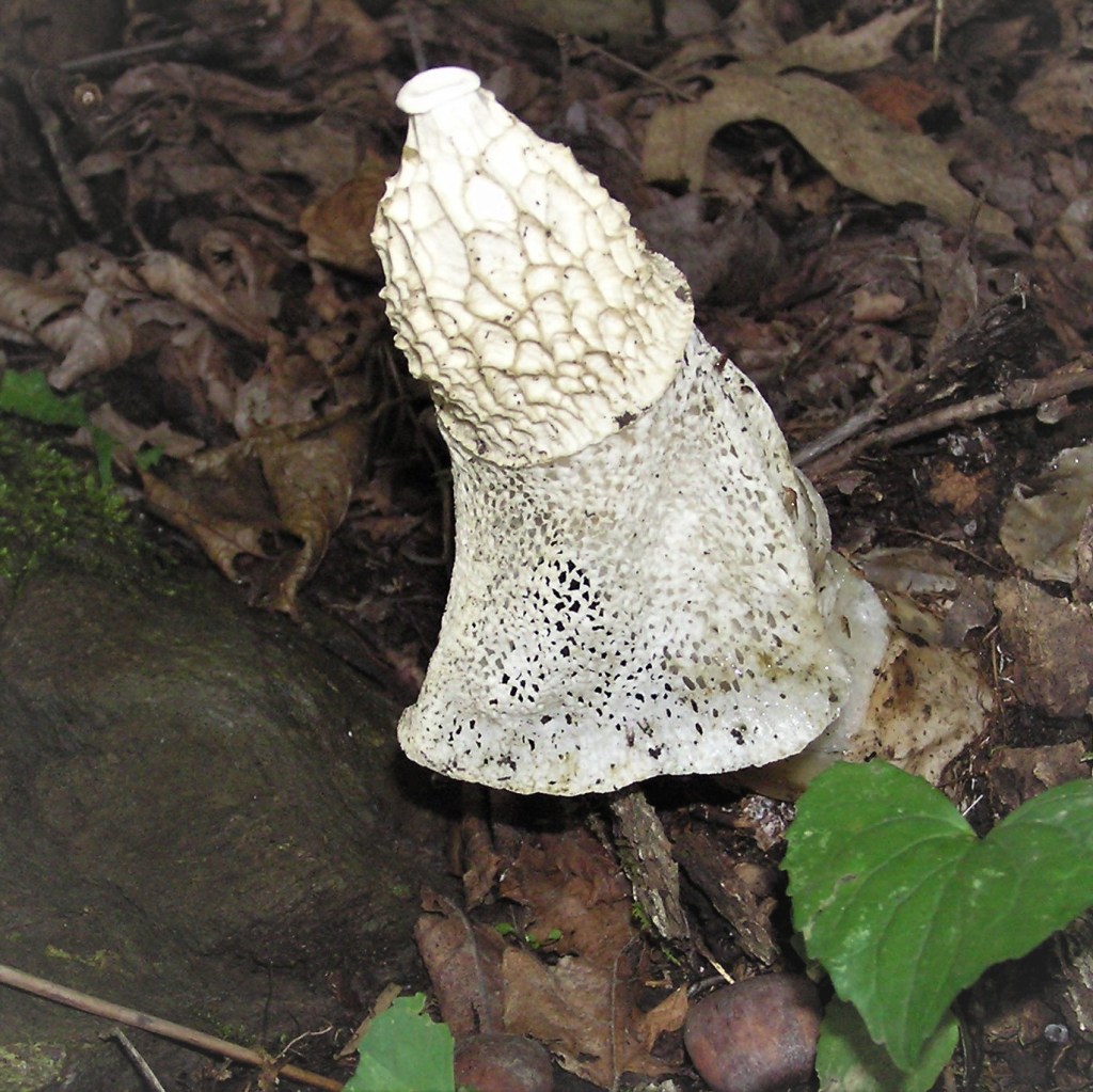 Not all members of the Stinkhorn family look like a penis. Some have lacey shrouds that extend downward from the tip like a hoop skirt with a hint of femininity. These scaffolds are not for decoration but for scaling. In that it has been established that each stinkhorn species is in partnership with some form of gleba eating insect, the rope ladder can only be to allow crawling bugs like carrion beetles to climb up to the top to access the sporulated slime. The local species is Dictyophora duplicata, (net-bearing, growing in pairs) which is commonly known as netted stinkhorn or wood witch. After the bugs have finished with their slime meal, the result reminds some of a bleached morel. While netted stinkhorns are relatively rare in North America, they are abundant in Asia.