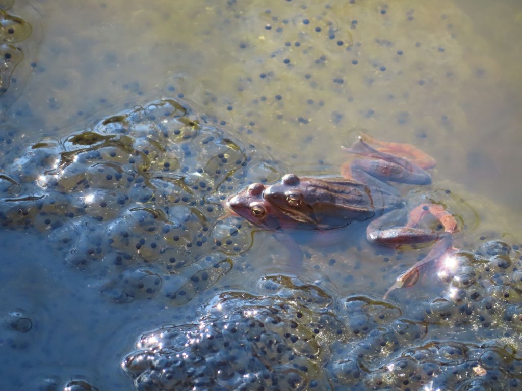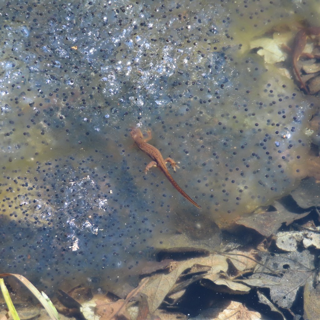 Wood frogs are the most visible, audible, and frequently encountered denizens of vernal pools. The reason is that they are obligate … they require an aqueous habitat for egg deposition and tadpole maturation. The sexual positioning of the male and female frogs depicted above is called amplexus (Latin for embrace) and can persist for days. Eggs are fertilized individually by male spermatozoa activated by contact with the water so they gradually float up and around the embracing couple. The protective and nutritive eggs are round sacs of yolk surrounding the frog embryo protected by a surface coat. They coalesce into softball size globules each with about a thousand eggs that float just beneath the pool surface like billowing clouds. The eggs, once adrift, are entirely on their own. [3] After several weeks, they hatch into tadpoles (Middle English for “toad head” as that is what they seemed to be). With a “beat the clock” mandate, tadpoles must mature to adulthood, develop lungs and venture ashore before seasonal heat turns the vernal pool into a slough of despond.